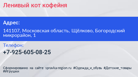 Ленивый кот, кофейня по адресу 141107, Московская область, Щёлково, Богородский микрорайон, 1 в дальнейшем Организация, размещена в следующих категориях: