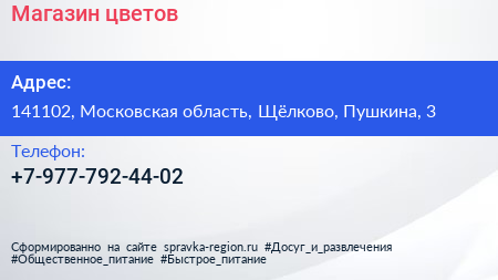 Магазин цветов по адресу 141102, Московская область, Щёлково, Пушкина, 3 в дальнейшем Организация, размещена в следующих категориях: