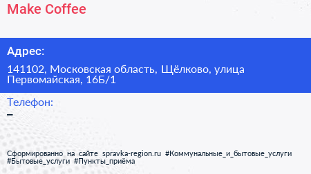 Make Coffee по адресу 141102, Московская область, Щёлково, улица Первомайская, 16Б/1 в дальнейшем Организация, размещена в следующих категориях: