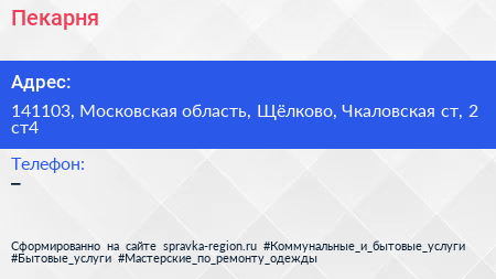 Пекарня по адресу 141103, Московская область, Щёлково, Чкаловская ст, 2 ст4 в дальнейшем Организация, размещена в следующих категориях: