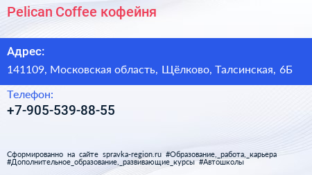 Pelican Coffee, кофейня по адресу 141109, Московская область, Щёлково, Талсинская, 6Б в дальнейшем Организация, размещена в следующих категориях: