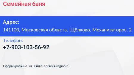 Семейная, баня по адресу 141100, Московская область, Щёлково, Механизаторов, 2 в дальнейшем Организация, размещена в следующих категориях: