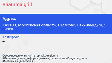 Shaurma & grill по адресу 141103, Московская область, Щёлково, Бахчиванджи, 5 киоск в дальнейшем Организация, размещена в следующих категориях: