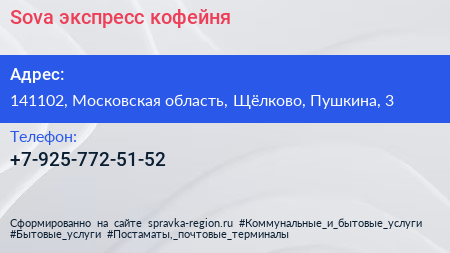 Sova, экспресс-кофейня по адресу 141102, Московская область, Щёлково, Пушкина, 3 в дальнейшем Организация, размещена в следующих категориях: