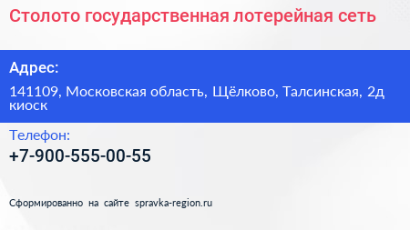 Столото, государственная лотерейная сеть по адресу 141109, Московская область, Щёлково, Талсинская, 2д киоск в дальнейшем Организация, размещена в следующих категориях: