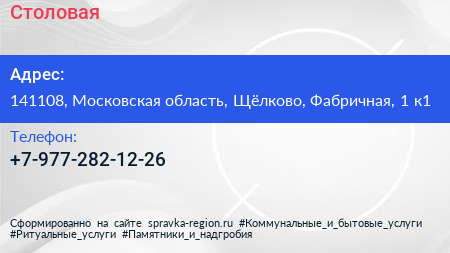 Столовая по адресу 141108, Московская область, Щёлково, Фабричная, 1 к1 в дальнейшем Организация, размещена в следующих категориях: