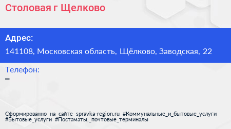 Столовая, г. Щелково по адресу 141108, Московская область, Щёлково, Заводская, 22 в дальнейшем Организация, размещена в следующих категориях: