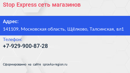 [Stop] Express, сеть магазинов по адресу 141109, Московская область, Щёлково, Талсинская, вл1 в дальнейшем Организация, размещена в следующих категориях: