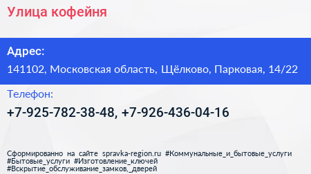 Улица, кофейня по адресу 141102, Московская область, Щёлково, Парковая, 14/22 в дальнейшем Организация, размещена в следующих категориях: