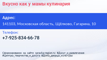 Вкусно, как у мамы!, кулинария по адресу 141103, Московская область, Щёлково, Гагарина, 10 в дальнейшем Организация, размещена в следующих категориях: