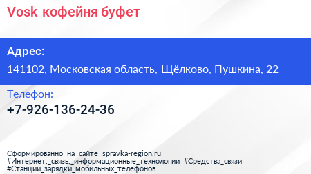 Vosk, кофейня-буфет по адресу 141102, Московская область, Щёлково, Пушкина, 22 в дальнейшем Организация, размещена в следующих категориях: