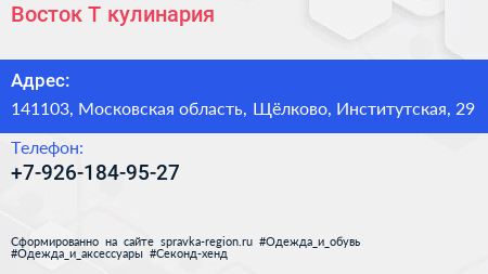 Восток-Т, кулинария по адресу 141103, Московская область, Щёлково, Институтская, 29 в дальнейшем Организация, размещена в следующих категориях:
