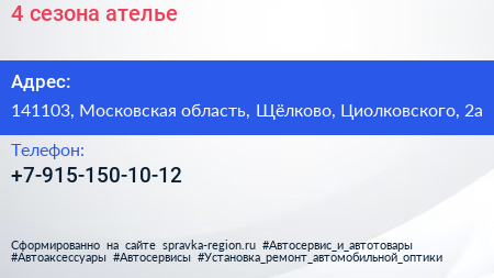 4 сезона, ателье по адресу 141103, Московская область, Щёлково, Циолковского, 2а в дальнейшем Организация, размещена в следующих категориях: