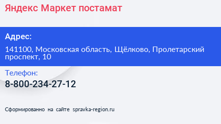 Яндекс.Маркет, постамат по адресу 141100, Московская область, Щёлково, Пролетарский проспект, 10 в дальнейшем Организация, размещена в следующих категориях: