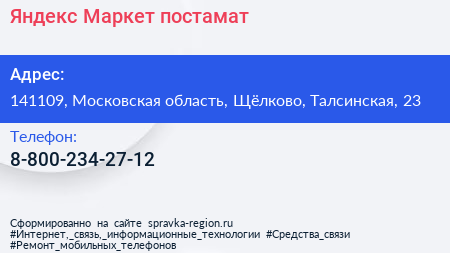 Яндекс.Маркет, постамат по адресу 141109, Московская область, Щёлково, Талсинская, 23 в дальнейшем Организация, размещена в следующих категориях: