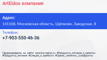 ArtEidos, компания по адресу 141108, Московская область, Щёлково, Заводская, 8 в дальнейшем Организация, размещена в следующих категориях: