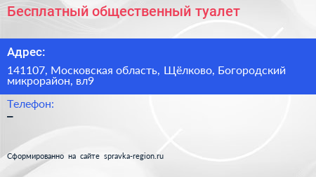 Бесплатный общественный туалет по адресу 141107, Московская область, Щёлково, Богородский микрорайон, вл9 в дальнейшем Организация, размещена в следующих категориях: