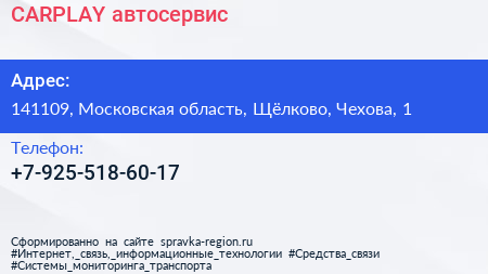 CARPLAY, автосервис по адресу 141109, Московская область, Щёлково, Чехова, 1 в дальнейшем Организация, размещена в следующих категориях: