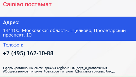 Cainiao, постамат по адресу 141100, Московская область, Щёлково, Пролетарский проспект, 10 в дальнейшем Организация, размещена в следующих категориях: