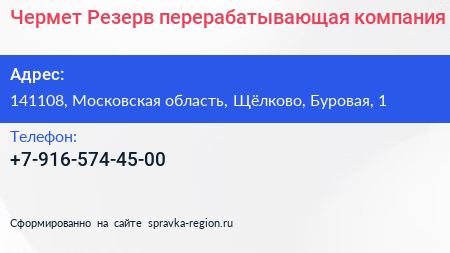 Чермет-Резерв, перерабатывающая компания по адресу 141108, Московская область, Щёлково, Буровая, 1 в дальнейшем Организация, размещена в следующих категориях: