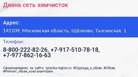 Диана, сеть химчисток по адресу 141109, Московская область, Щёлково, Талсинская, 1 в дальнейшем Организация, размещена в следующих категориях: