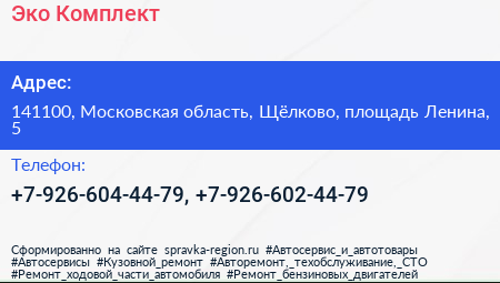Эко Комплект+ по адресу 141100, Московская область, Щёлково, площадь Ленина, 5 в дальнейшем Организация, размещена в следующих категориях: