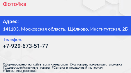 Фото4ка по адресу 141103, Московская область, Щёлково, Институтская, 2Б в дальнейшем Организация, размещена в следующих категориях: