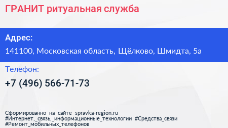 ГРАНИТ, ритуальная служба по адресу 141100, Московская область, Щёлково, Шмидта, 5а в дальнейшем Организация, размещена в следующих категориях: