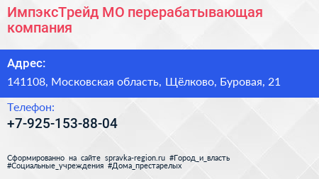ИмпэксТрейд-МО, перерабатывающая компания по адресу 141108, Московская область, Щёлково, Буровая, 21 в дальнейшем Организация, размещена в следующих категориях: