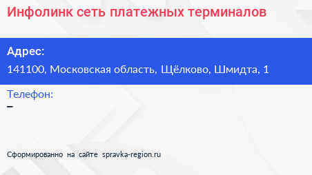 Инфолинк, сеть платежных терминалов по адресу 141100, Московская область, Щёлково, Шмидта, 1 в дальнейшем Организация, размещена в следующих категориях: