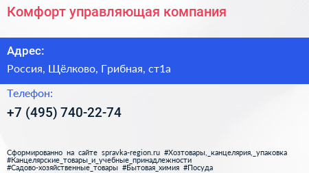 Комфорт, управляющая компания по адресу Пятёрочка, 1А, Грибная улица, КП «Заповедный парк-2», Валентиновка, Оболдино, городской округ Щёлково, Московская область, Центральный федеральный округ, 141134, Россия в дальнейшем Организация, размещена в следующих категориях: