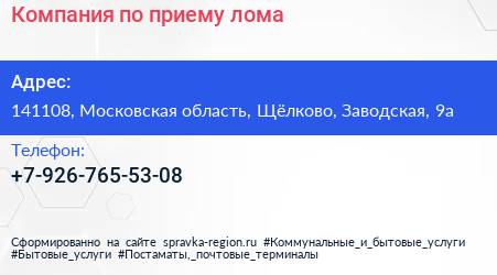 Компания по приему лома по адресу 141108, Московская область, Щёлково, Заводская, 9а в дальнейшем Организация, размещена в следующих категориях: