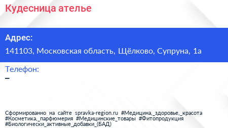 Кудесница, ателье по адресу 141103, Московская область, Щёлково, Супруна, 1а в дальнейшем Организация, размещена в следующих категориях: