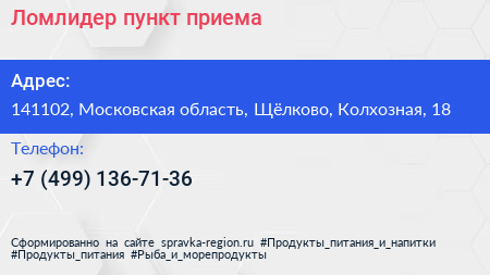 Ломлидер, пункт приема по адресу 141102, Московская область, Щёлково, Колхозная, 18 в дальнейшем Организация, размещена в следующих категориях: