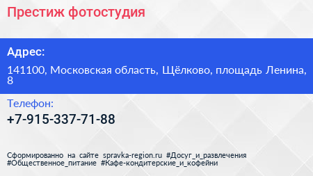 Престиж, фотостудия по адресу 141100, Московская область, Щёлково, площадь Ленина, 8 в дальнейшем Организация, размещена в следующих категориях: