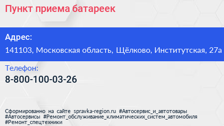 Пункт приема батареек по адресу 141103, Московская область, Щёлково, Институтская, 27а в дальнейшем Организация, размещена в следующих категориях: