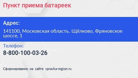 Пункт приема батареек по адресу 141100, Московская область, Щёлково, Фряновское шоссе, 1 в дальнейшем Организация, размещена в следующих категориях: