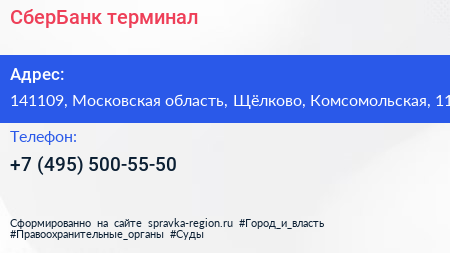СберБанк, терминал по адресу 141109, Московская область, Щёлково, Комсомольская, 11 в дальнейшем Организация, размещена в следующих категориях: