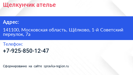 Щелкунчик, ателье по адресу 141100, Московская область, Щёлково, 1-й Советский переулок, 7а в дальнейшем Организация, размещена в следующих категориях: