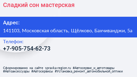 Сладкий сон, мастерская по адресу 141103, Московская область, Щёлково, Бахчиванджи, 5а в дальнейшем Организация, размещена в следующих категориях: