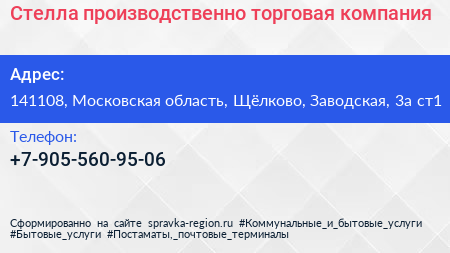 Стелла, производственно-торговая компания по адресу 141108, Московская область, Щёлково, Заводская, 3а ст1 в дальнейшем Организация, размещена в следующих категориях: