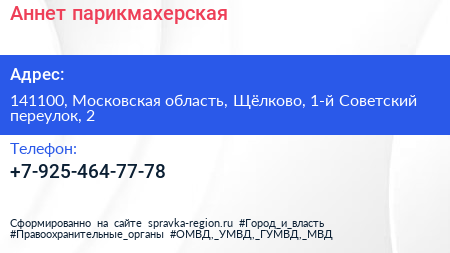 Аннет, парикмахерская по адресу 141100, Московская область, Щёлково, 1-й Советский переулок, 2 в дальнейшем Организация, размещена в следующих категориях:
