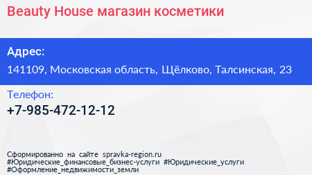 Beauty House, магазин косметики по адресу 141109, Московская область, Щёлково, Талсинская, 23 в дальнейшем Организация, размещена в следующих категориях: