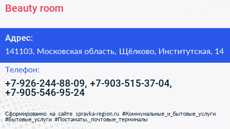 Beauty room по адресу 141103, Московская область, Щёлково, Институтская, 14 в дальнейшем Организация, размещена в следующих категориях: