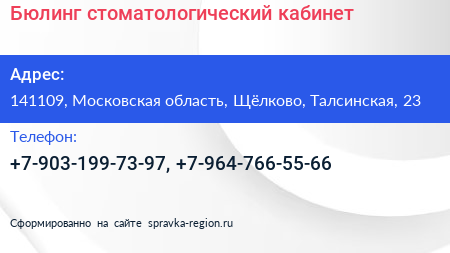 Бюлинг, стоматологический кабинет по адресу 141109, Московская область, Щёлково, Талсинская, 23 в дальнейшем Организация, размещена в следующих категориях: