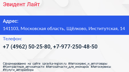 Эвидент Лайт по адресу 141103, Московская область, Щёлково, Институтская, 14 в дальнейшем Организация, размещена в следующих категориях: