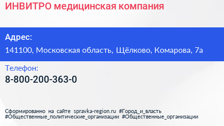 ИНВИТРО, медицинская компания по адресу 141100, Московская область, Щёлково, Комарова, 7а в дальнейшем Организация, размещена в следующих категориях: