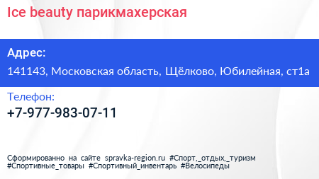 Ice beauty, парикмахерская по адресу 141143, Московская область, Щёлково, Юбилейная, ст1а в дальнейшем Организация, размещена в следующих категориях: