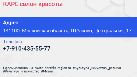КАРЕ, салон красоты по адресу 141100, Московская область, Щёлково, Центральная, 17 в дальнейшем Организация, размещена в следующих категориях: