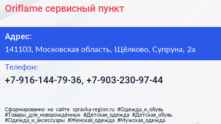 Oriflame, сервисный пункт по адресу 141103, Московская область, Щёлково, Супруна, 2а в дальнейшем Организация, размещена в следующих категориях: